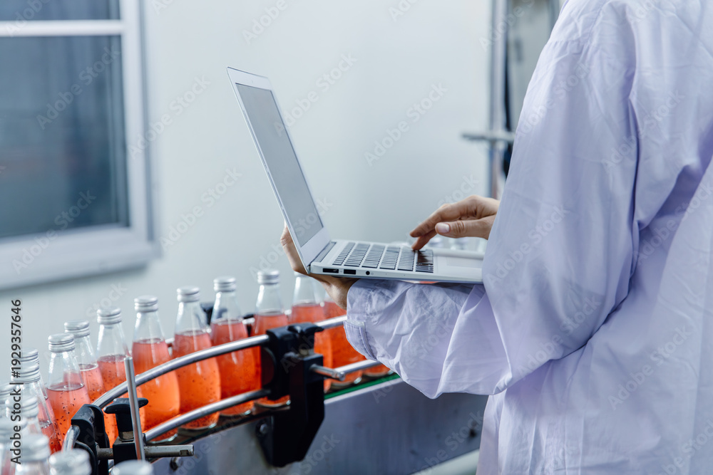 Closeup worker using laptop record products data at production line in food and drinks factory #1929357646