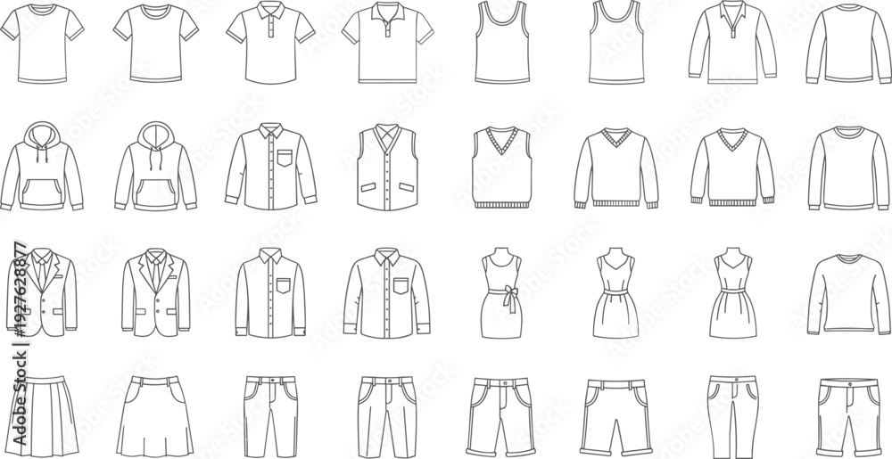 Clothing outline icons vector set with shirts jackets dresses pants and casual apparel line art collection #1927628877