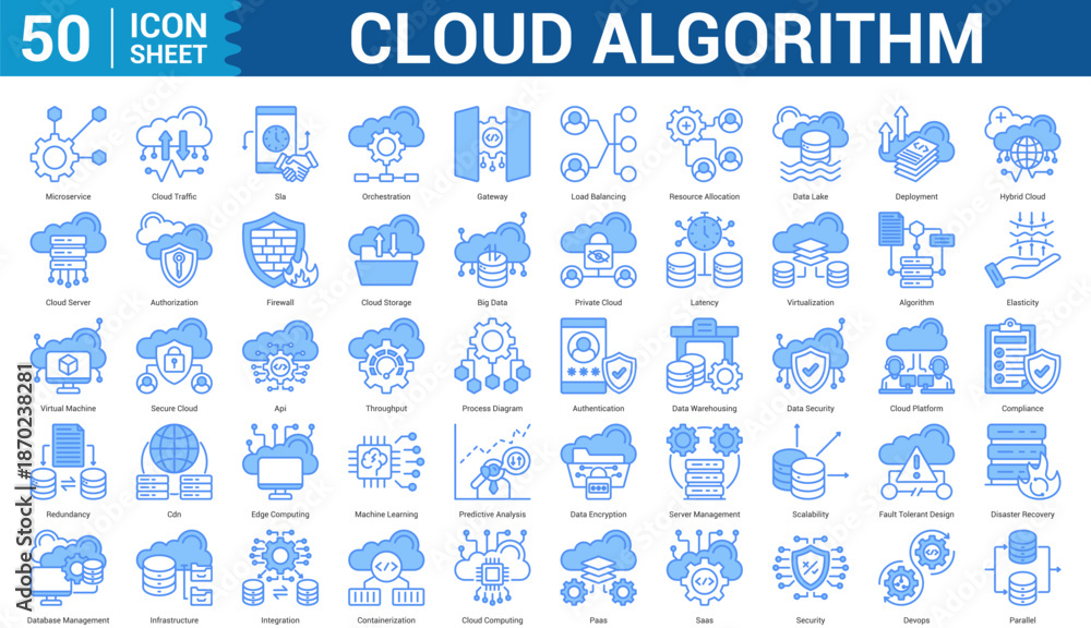 Cloud Algorithm blue style icon set collection concept microservice, cloud traffic, orchestration, gateway, load balancing, resource allocation, data lake, deployment, hybrid cloud, and more. #1870238281