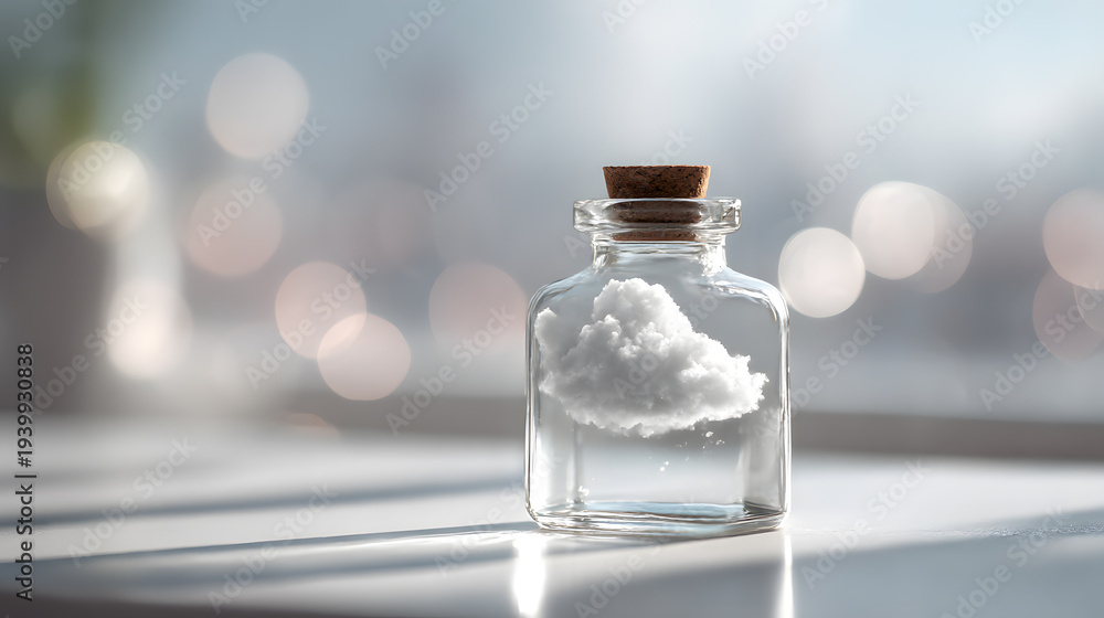 Cloud in a Bottle: A small glass bottle cradles a pristine cloud, with a cork stopper, placed in a soft, bright, and blurred background. Representing purity and serenity. #1939930838