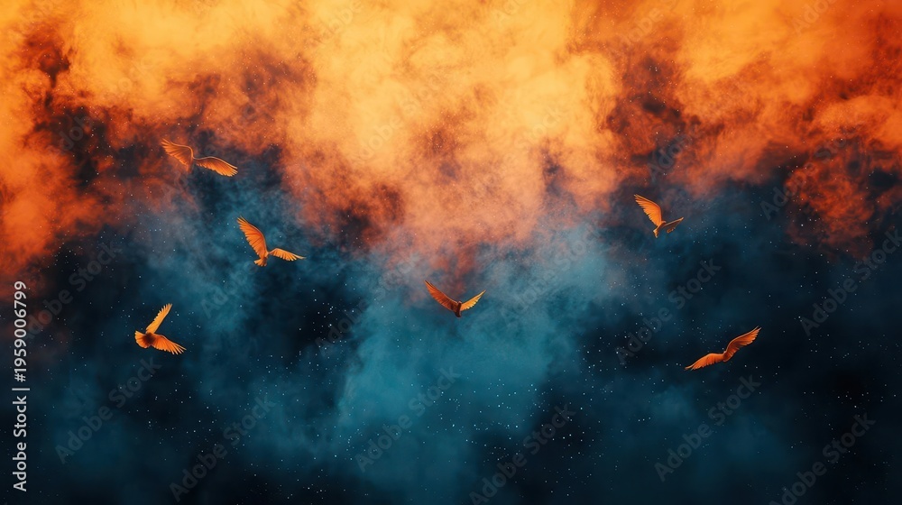 Cloud of nebula smoke turning into golden birds in space, creative symbolic flight #1959006799