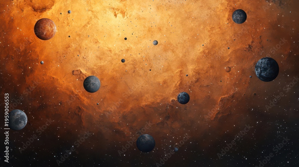 Cluster of planets orbiting within vibrant nebula gas field, rich scifi composition #1959006553
