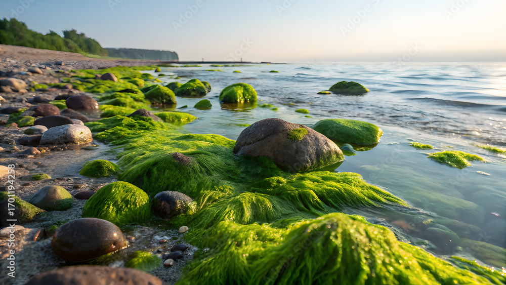 Coastal rocks covered in bright green moss at the edge of the sea #1701194258