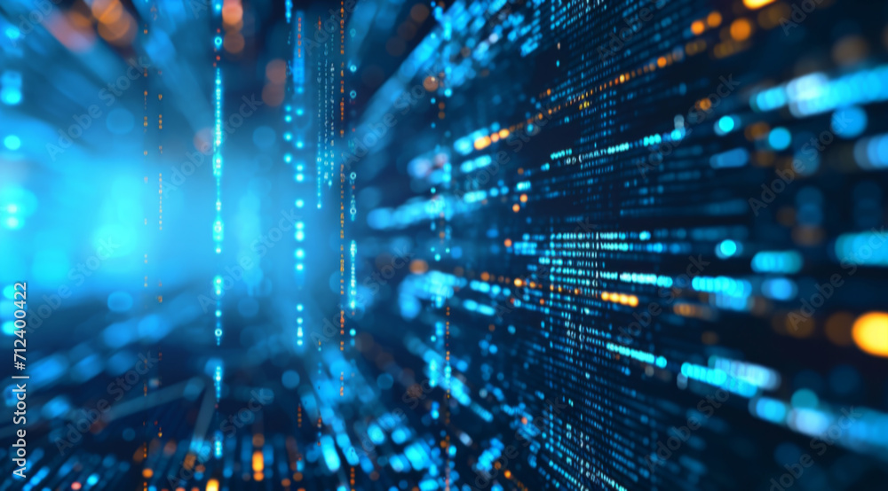 Code, internet and big data connection for cloud storage, artificial intelligence and coding. Blue, matrix and network connectivity for ai algorithm, quantum computing and communication background #712400422