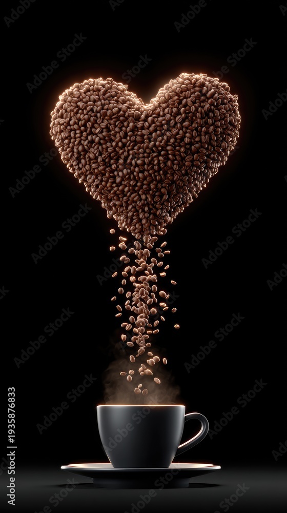 Coffee Love: Heart-Shaped Coffee Beans Floating Above Steaming Cup #1935876833
