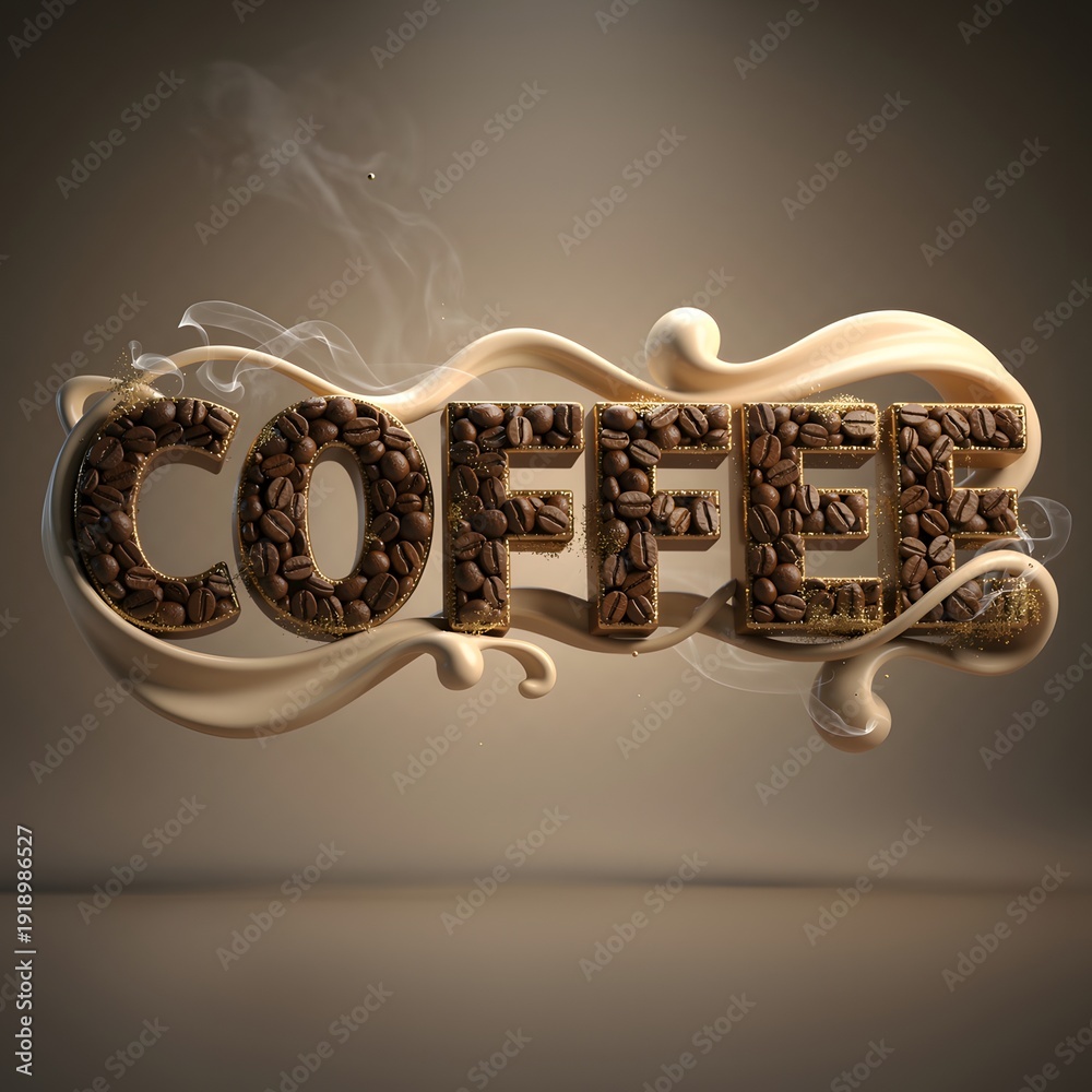 Coffee text created from roasted beans surrounded by swirling milk cream and steam on brown background for cafe branding #1918986527