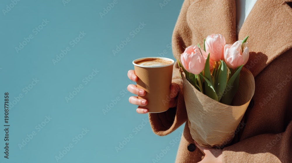 Coffee & Tulips: A person holds a cup of coffee and a bouquet of tulips, a delightful contrast of textures and colors against a serene backdrop, creating a moment of simple pleasures. #1908771858