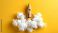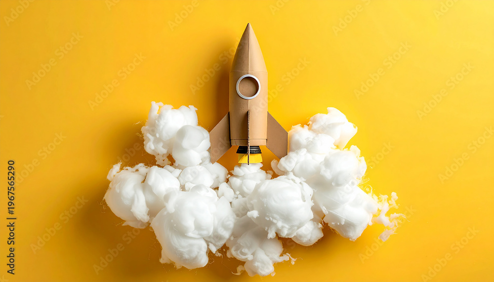 Cohete de cartulina azul con humo de algodón sobre fondo amarillo, ideas, emprendimiento, innovación, startups marketing, tecnología, crecimiento, imaginación y exito en desarrollo de proyectos #1967565290