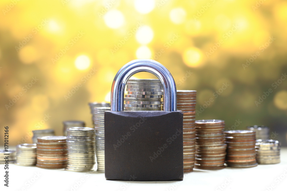 Coin money stack and lock, on gold light background. Saving and financial security concept. #171012166