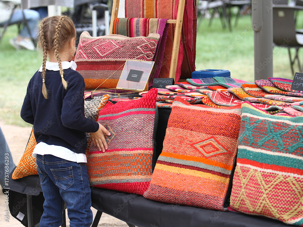 Niña en puesto de mercadillo con cojín y fundas de bazar artesanal #1737686293
