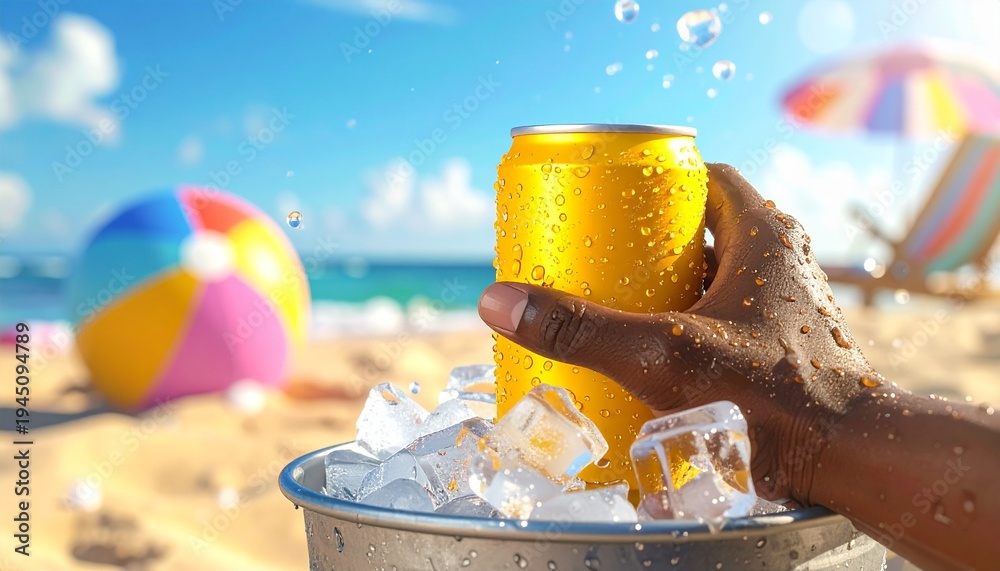 Cold can of drink on a sunny beach, summer refreshment #1945094789