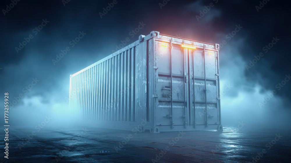 Cold chain container with glowing temperature indicator in misty environment, secure storage for pharmaceuticals and sensitive goods #1773255928
