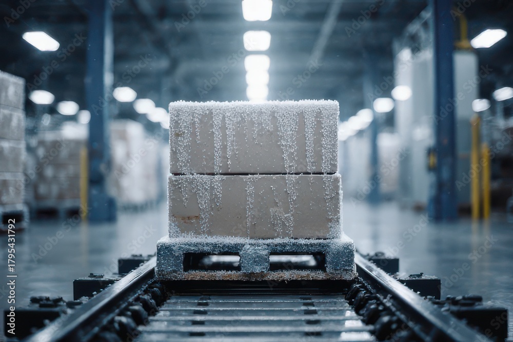 Cold Chain Fulfillment Center: Refrigerated pallets glide on automated rails beneath glowing ceiling sensors #1795431792