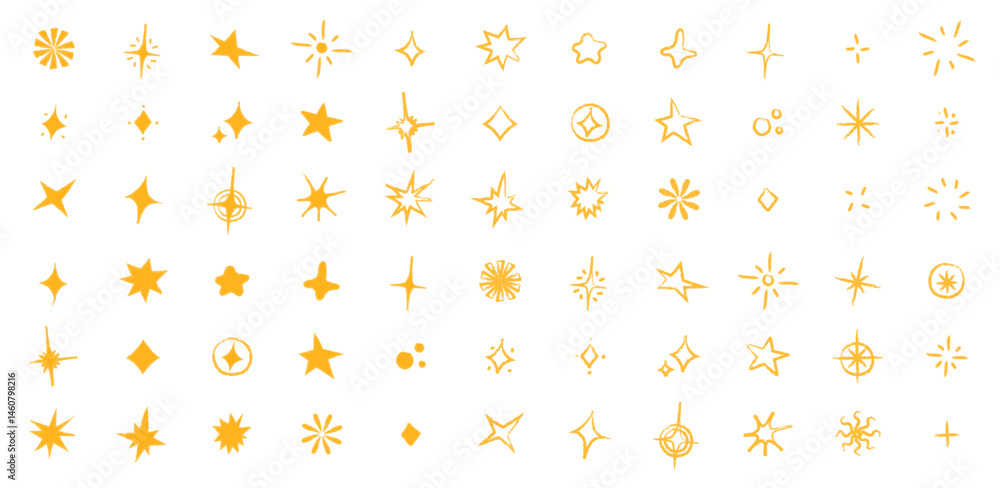 Colección - Set de ilustraciones decorativas dibujadas a mano de brillos, estrellas y destellos color dorado. Vector. #1460798216