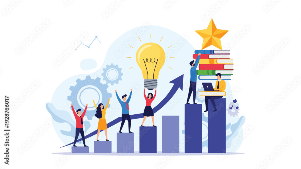 Collaborative business team achieving great success and innovation by building a foundation of knowledge and strategy toward a star goal. #1928766017