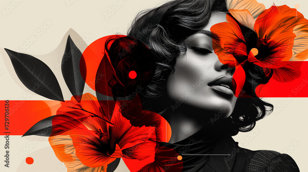 collage of a african american woman's face in black and white with abstract shapes and cropped red flowers on background, digital art for Horizontal cinematic poster, retro vintage art. Ai #729706136