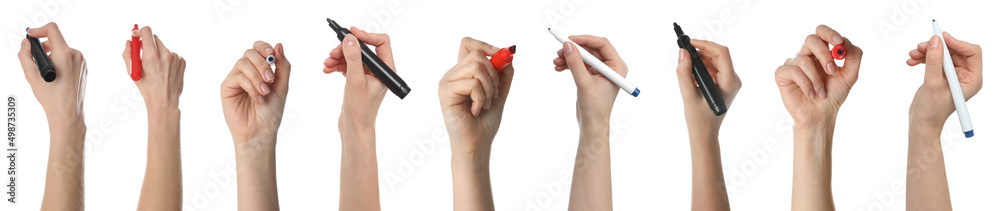 Collage with photos of woman holding different markers on white background, closeup #498735309