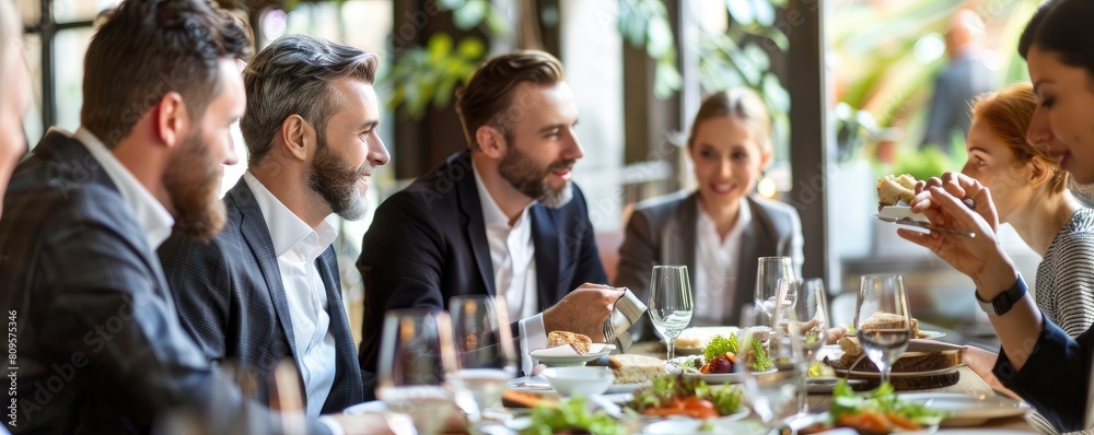Colleagues having a friendly business lunch in a classy restaurant, enjoying food and conversation. #809575346