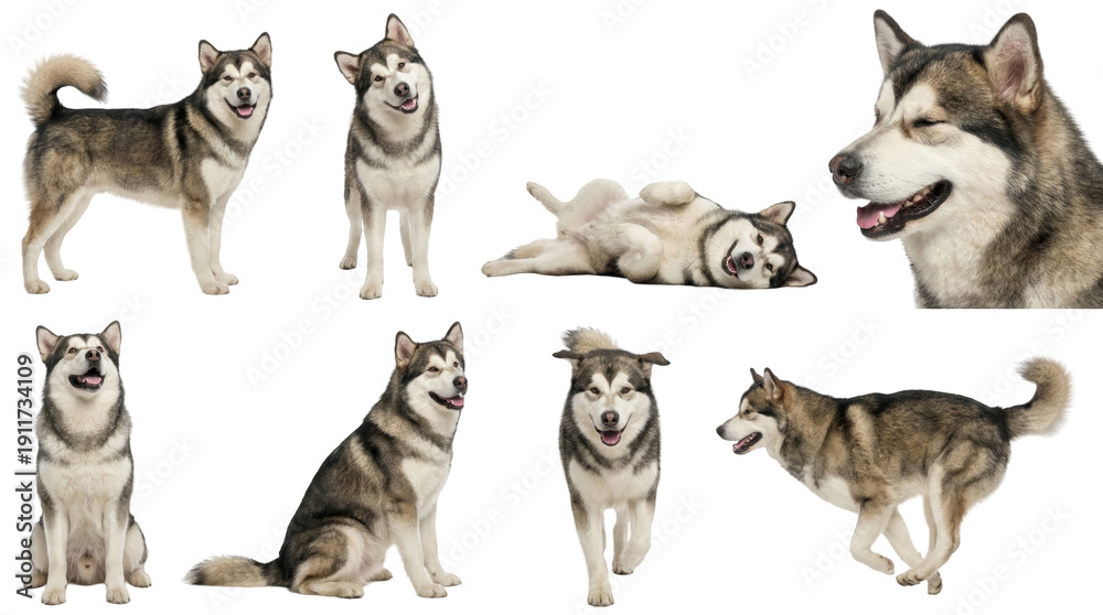 collection of alaskan malamute dogs in different poses on isolated background #1911734109