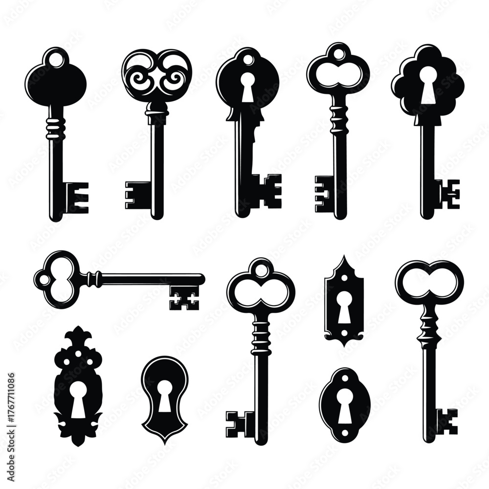 Collection of antique keys and ornate keyholes black silhouettes #1767711086