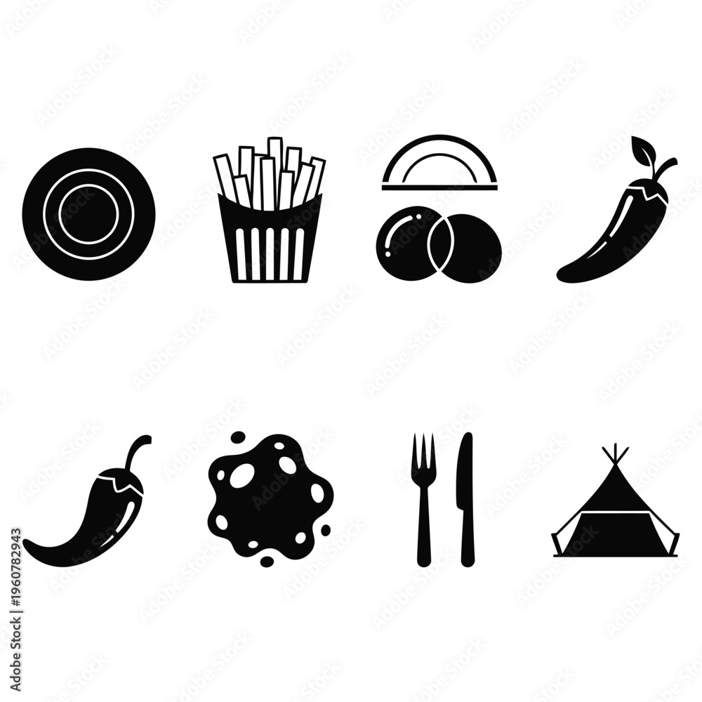Collection of black food and camping icons on white background. Food and dining related icons including on white background #1960782943