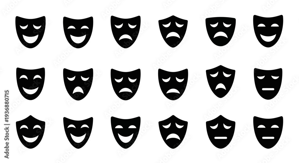Collection of black theater masks representing various emotions displayed on a plain white background #1936880715