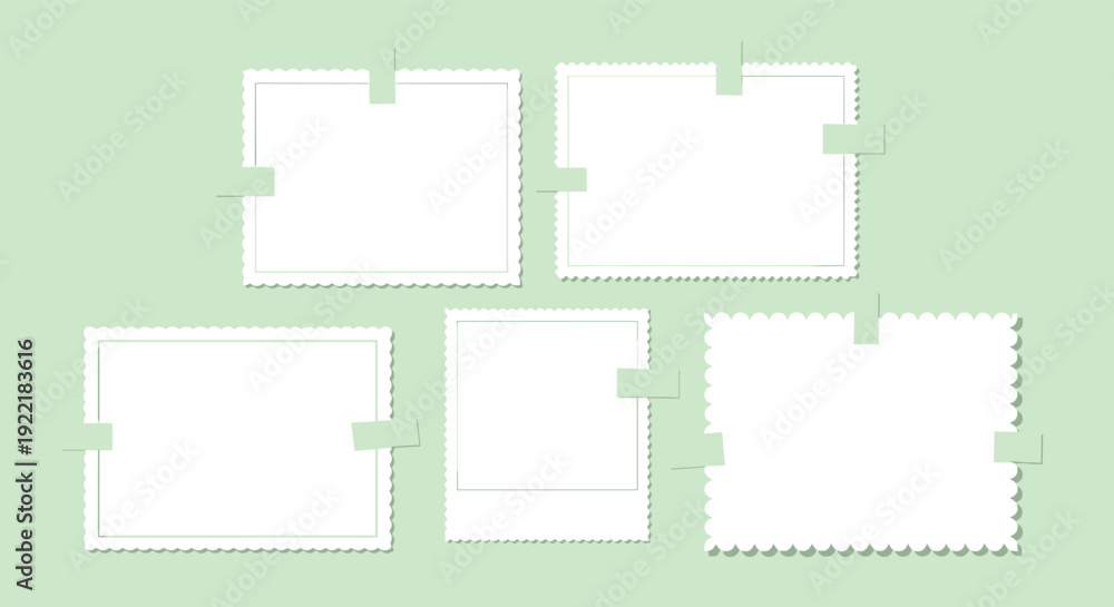 Collection of blank white vintage photo frames with scalloped edges attached to a light green background with small pieces of masking tape. #1922183616
