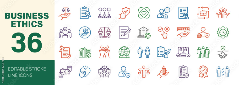 Collection of business ethics icons in various colors representing different concepts and ideas #1926157376