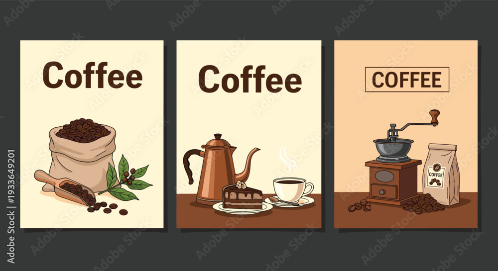 Collection of coffee themed posters showing a sack of roasted beans, a coffee pot with cake, and a vintage hand grinder. #1933649201