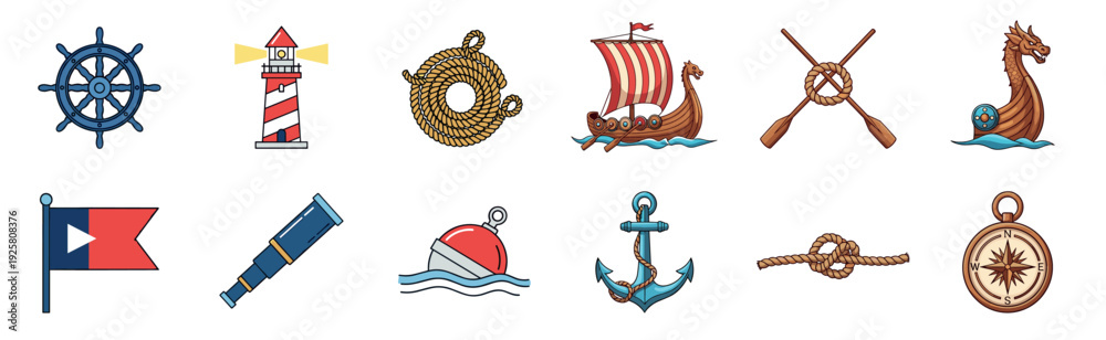 Collection of colorful nautical cartoon icons featuring a ship's wheel, lighthouse, anchor, Viking longship, compass, rope, and spyglass in a detailed illustrated set #1925808376
