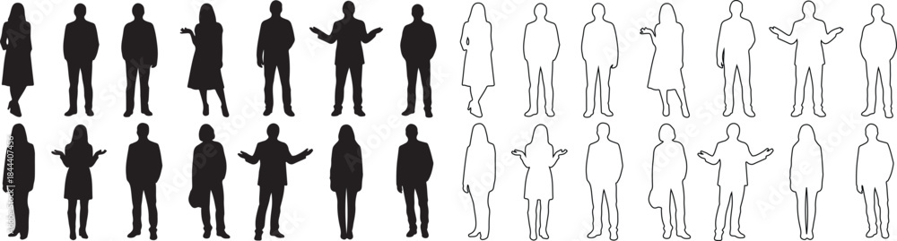 Collection of Diverse Standing People Vector Silhouettes and Outline Figures isolated PNG with Transparent Background #1844407456