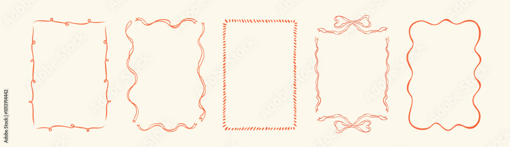 Collection of doodle hand drawn trendy frames with wavy lines, bows and ribbons. Minimalist line art. Modern whimsical borders for wedding invitations, birthday card, lunch menus. Vector illustration. #1013914442