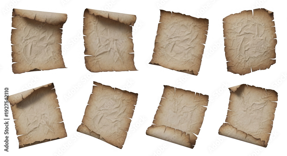 collection of eight aged paper scrolls isolated on a white background historical documents design #1927542110