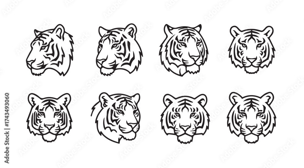 Collection of eight expressive tiger head line art portraits in various poses and angles vector #1743493060