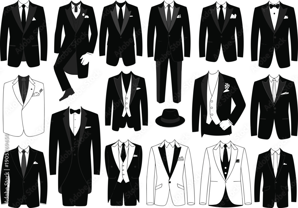 Collection of elegant black and white tuxedo suits, formal menswear set with bow ties, vests, jackets and accessories isolated vector illustration #1905769650