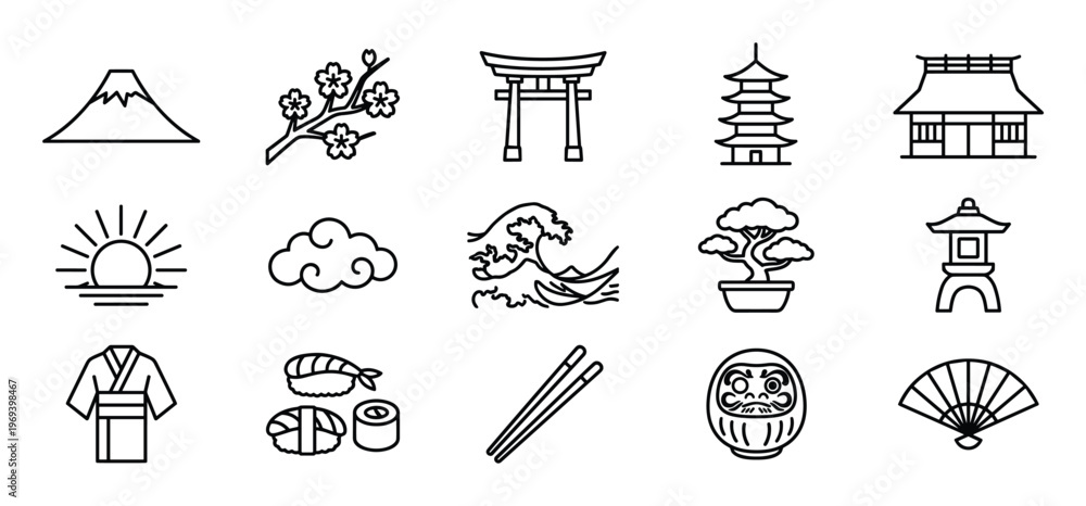 Collection of fifteen black outline Japanese culture icons, including Mount Fuji, cherry blossoms, and a torii gate, presented in a clean, minimalist style #1969398467