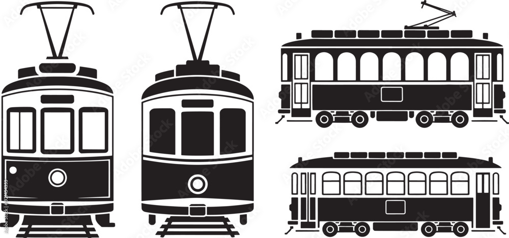 Collection of four vintage tram silhouettes front side and perspective views on grid #1921454353
