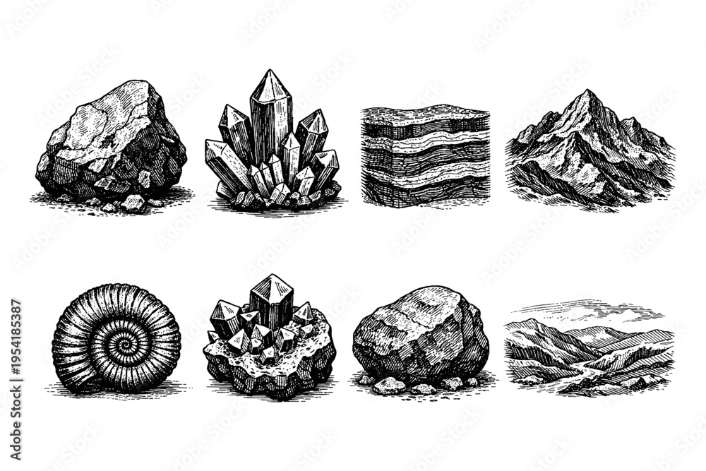 Collection of geological and paleontological illustrations in vintage style #1954185387