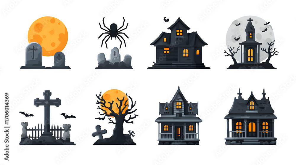 Collection of Halloween icons including tombstone, full moon, spider, and haunted house, isolated on white background #1706014369