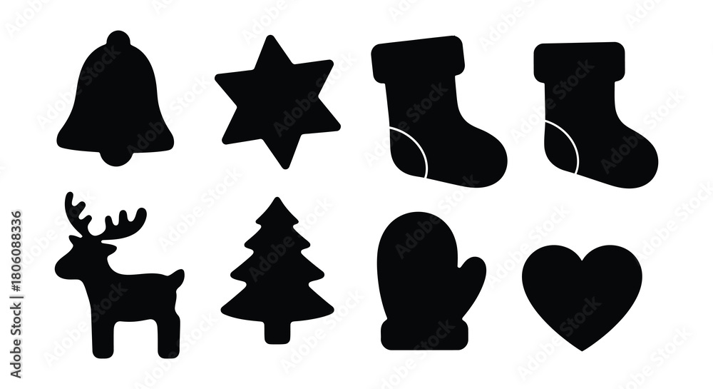 Collection of hand drawn black silhouette christmas ornaments and symbols on white background #1806088336