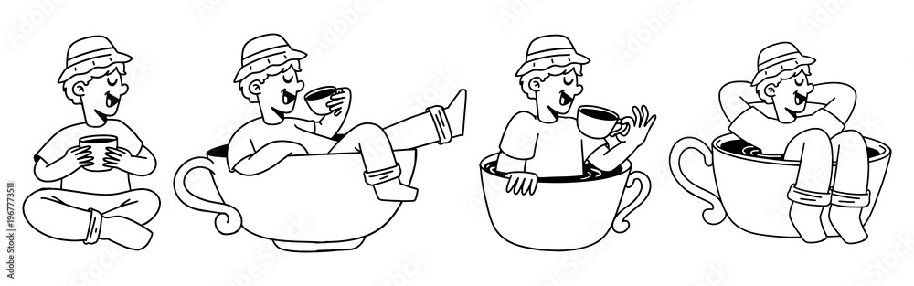 Collection of Hand Drawn Men Relaxing and Drinking Coffee Inside Large Glass Illustrations #1967773511