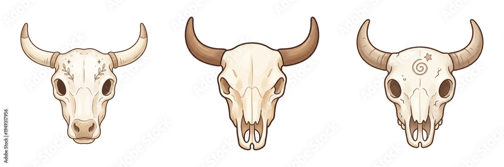 Collection of Illustrated Bull Skulls with Horns Featuring Decorative Patterns #1949317956