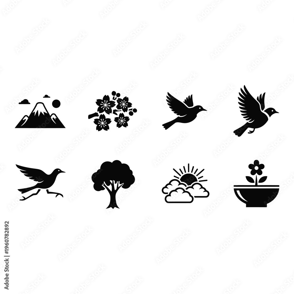 Collection of nature icons featuring birds, tree, mountain, and flowers in black silhouette on white background #1960782892
