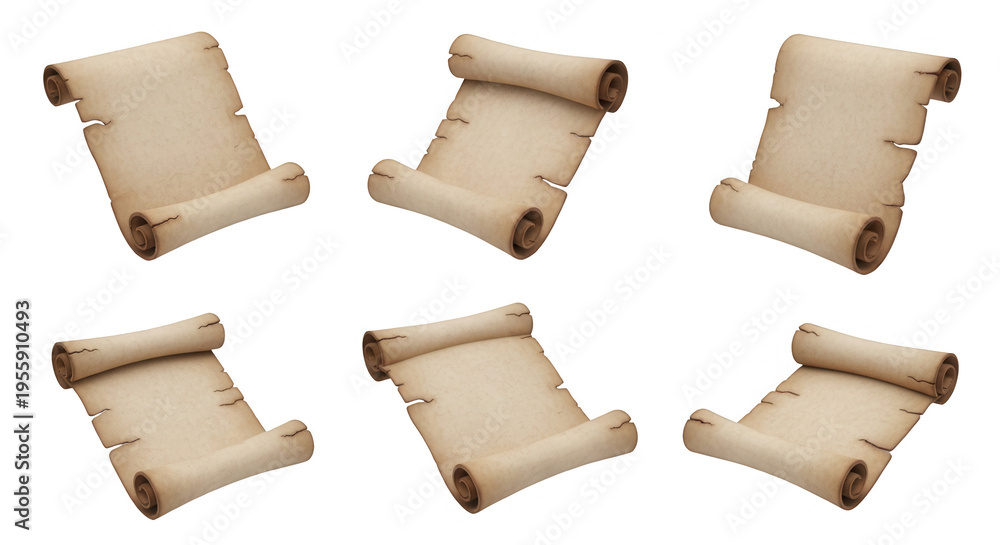 collection of old parchment scrolls arranged on white surface for presenting historical or legal documents and messages isolated #1955910493