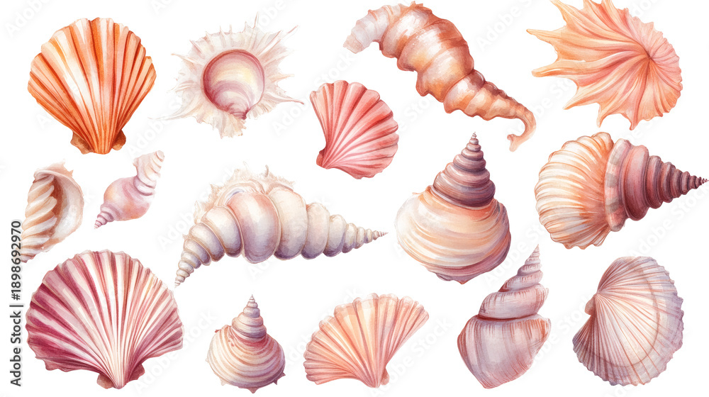 Collection of pastel pink and orange seashells isolated on black, assorted scallop and spiral shells arranged as a decorative set for beach, marine, and summer design. #1898692970