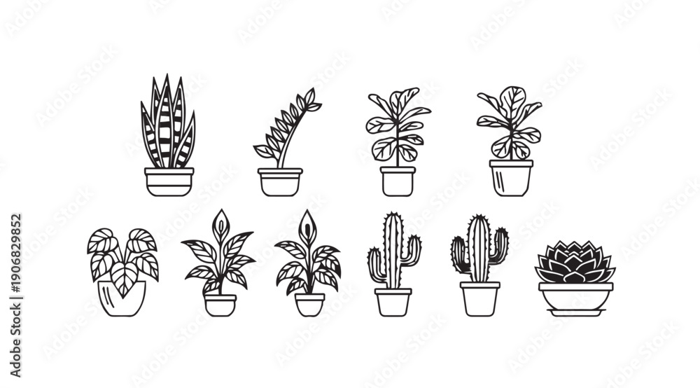Collection of Potted Houseplants Line Art Vector Illustrations #1906829852