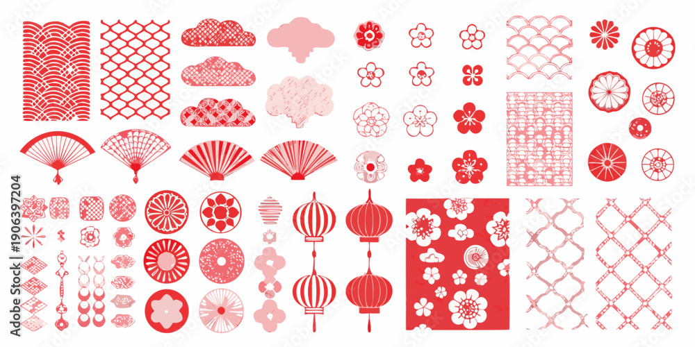 Collection of red asian patterned elements and floral motifs on white #1906397204