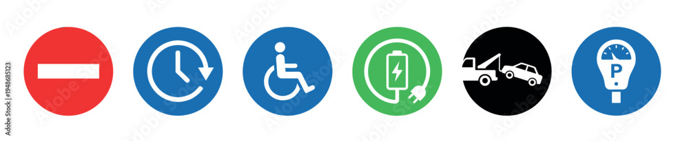 Collection of six colorful circular road and parking signs includes symbols for no entry, time limits, disabled access, electric charging, no towing, and paid parking. #1948685123
