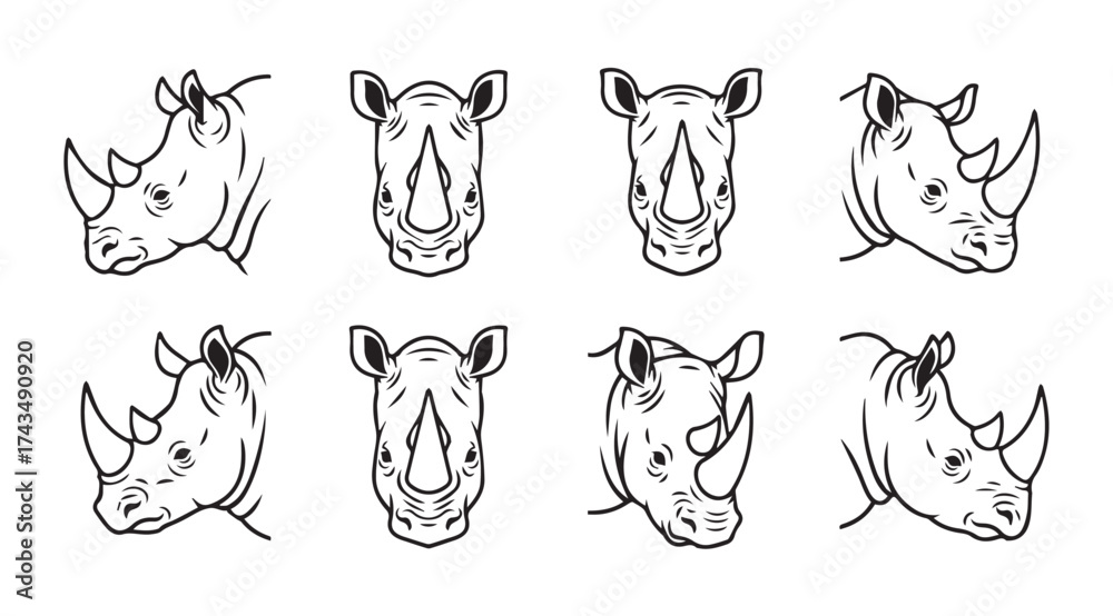 Collection of sketchy rhinoceros heads in different poses for wildlife art and design vector #1743490920