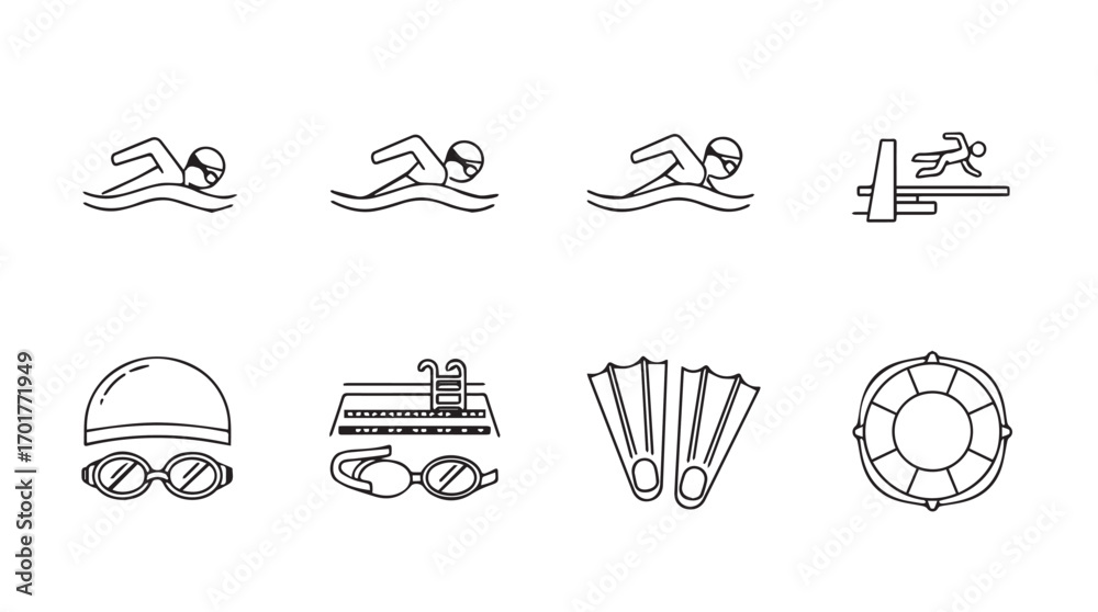 Collection of swimming icons and symbols in a simple line art silhouette style #1701771949